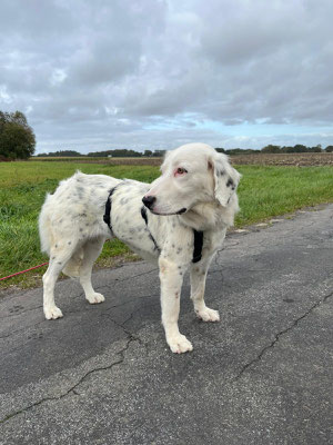 An der Leine läuft Amanda bereits sehr schön – ohne zu ziehen – und Hundebegegnungen meistert sie eher ruhig und vorsichtig.