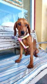 - freundlich, verträglich mit Artgenossen, kennt das Laufen an der Leine